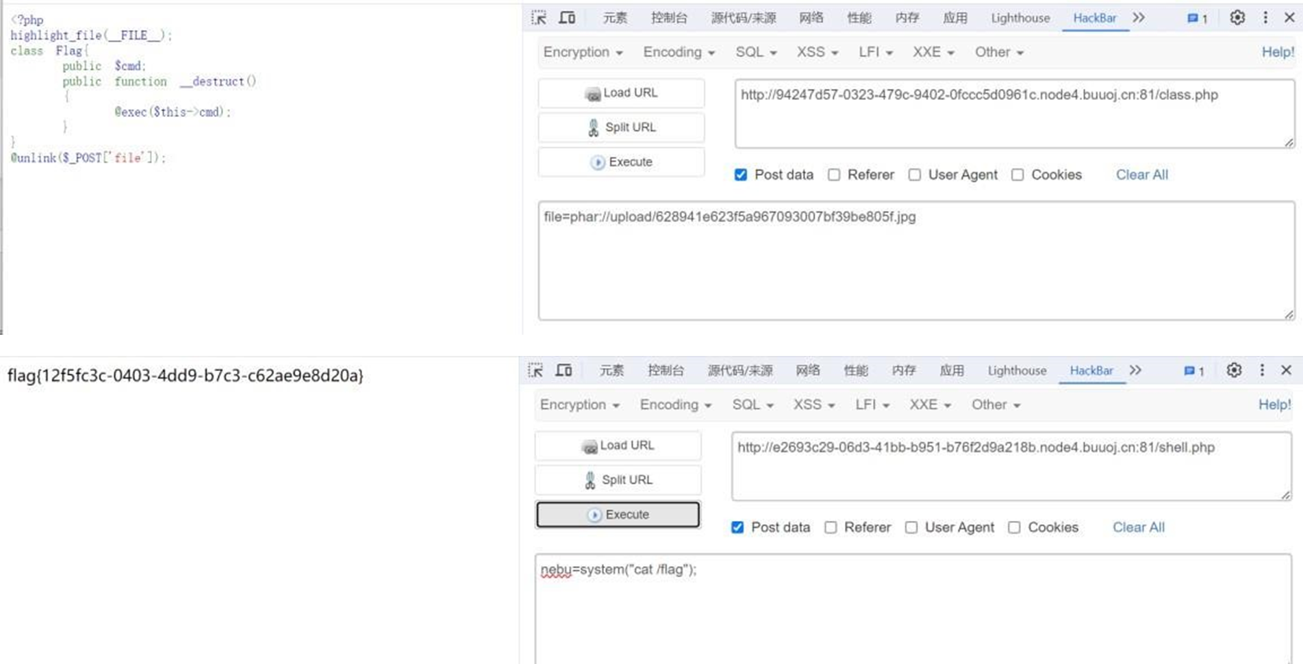 有个恶意类,但没有 unserialize()函数,但有 unlink 函数,再结合文件上传,那思路非常明显,上传一个 phar 文件,再用 phar 伪协议访问执行。