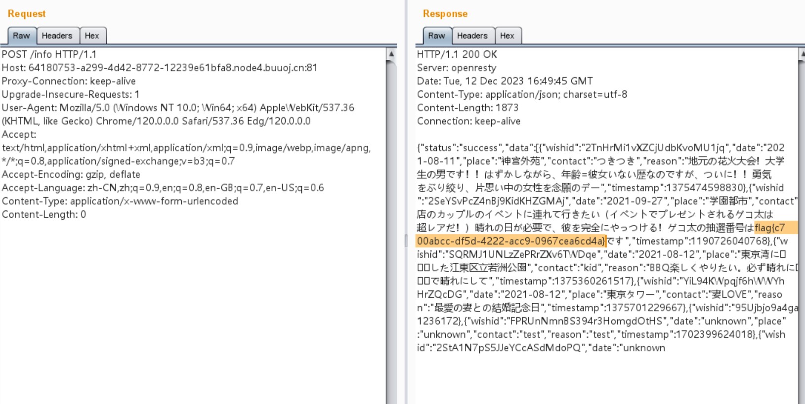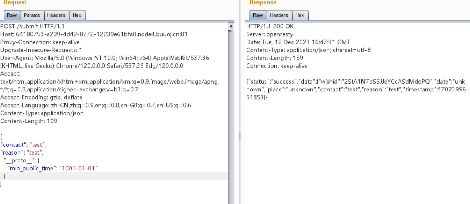 至此,原型链污染就已经成功了,然后我们访问info路由,将数据包时间戳改成0,timestamp就赋值为1001-1-30,就可成功查询。