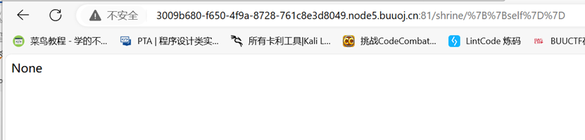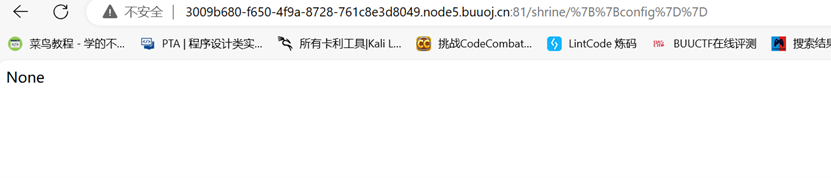 接着往下看,这个路由返回flask.render_template_string(safe_jinja(shrine)),即把用户的输入和前面的{{% set config=None%}}{{% set self=None%}}连起来传给渲染函数。也就是说当我们进行ssti时,config和self这两个参数的值会是None。验证一下: