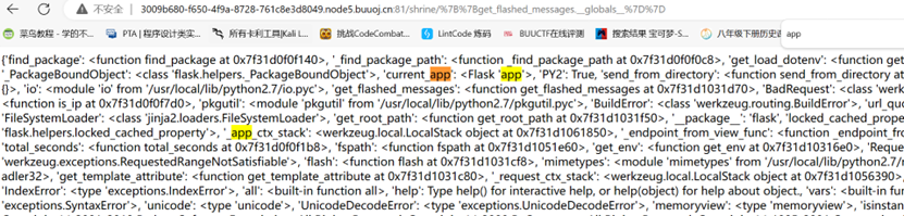 虽然直接获取config的方法被ban了,但是我们还是可以通过全局变量访问当前程序来获取config的。我们需要利用python里的get_flashed_messages()函数,这个函数是用于获取 Flask 消息闪现机制的信息,然后返回给用户的。一般是用来发个警告。不管如何,它接收一个参数,这个参数是可以返回给我们的。那么就可以构造payload:{{get_flashed_messages.__globals__}}