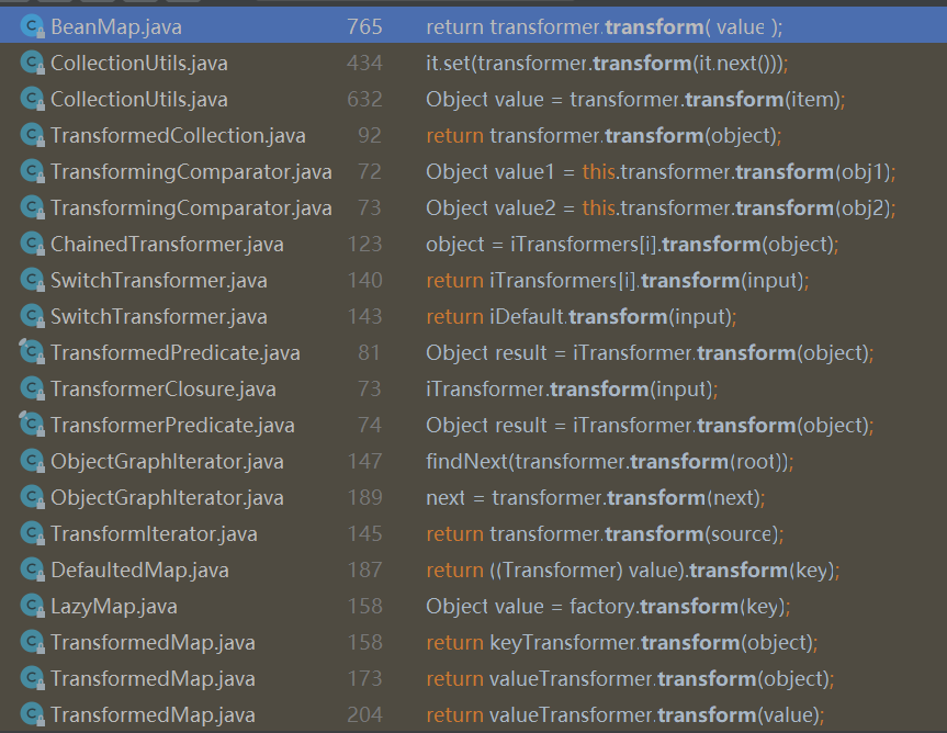 发现非常多,但只有一个可以成链子那就是TransformedMap类的调用(其余的如果感兴趣自己分析)
