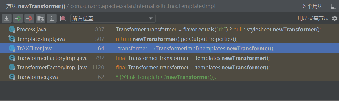 有很多类,我们直接步入正题查看com.sun.org.apache.xalan.internal.xsltc.trax.TrAXFilter类,调用逻辑为: