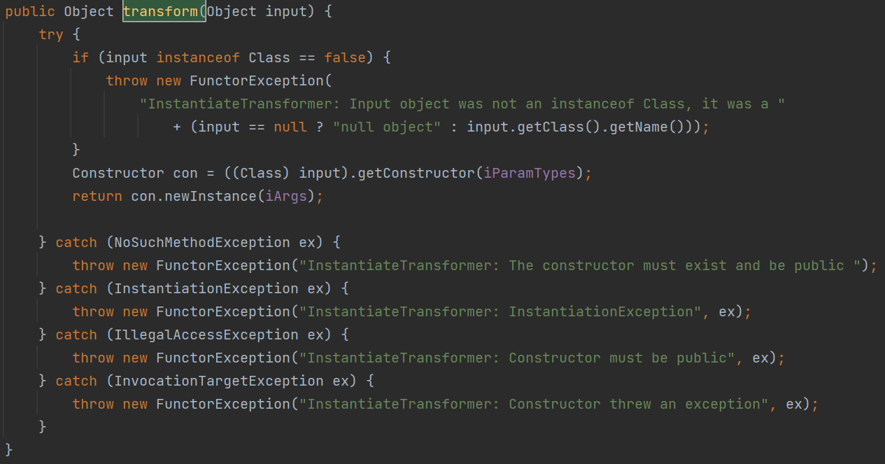 1 2 3 4 5 public InstantiateTransformer(Class[] paramTypes, Object[] args) { super(); iParamTypes = paramTypes; iArgs = args; }